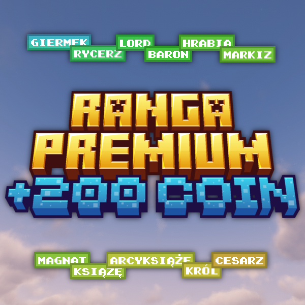 Z każdym zakupem rangi, otrzymasz również 200 coinów! To tylko nieco mniej niż zakup samych coinów w sklepie w podobnej cenie – co się całkiem opłaca 😉 Za coiny możesz kupić najróżniejsze itemki premium w naszym Cash Shopie na spawnie – sprawdź!
